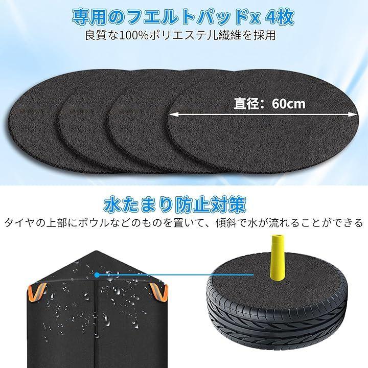 直径60cmの大判フェルトパッドが4枚付属しており、フェルトバッドをセットすることにより、タイヤの日常保管・ホコリ・傷防止・劣化防止・雨や汚れ・紫外線の対策に優れた保護効果を発揮します。
