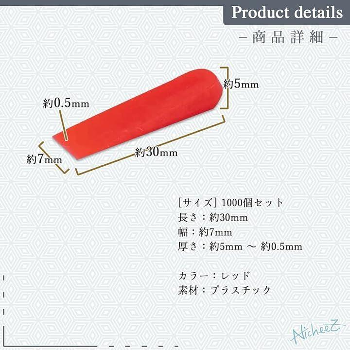 「商品内容」タイルスペーサー セット数:1000個 素材:プラスチック サイズ:厚さ/約0.5mm~5mm 幅/約7mm 長さ/30mm カラー:レッド