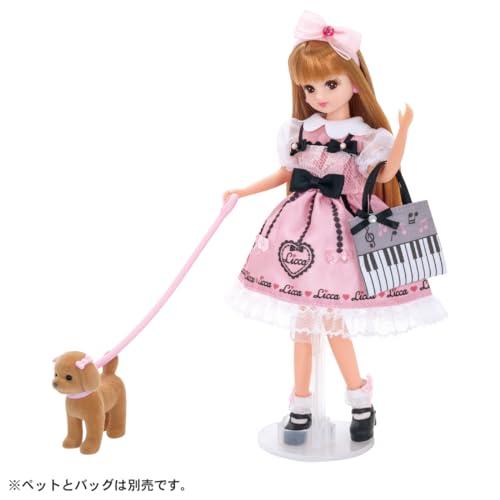 淡いピンクのキュートなドレスを着たリカちゃんです。ピンクのドレスに黒のリボンやプリントがアクセントになっています。カチューシャ、ソックス、黒のストラップシューズ付き。【セット内容】人形(ドレス、ソックス、カチューシャ、イヤリング、下着着用)(1),クツ(1),