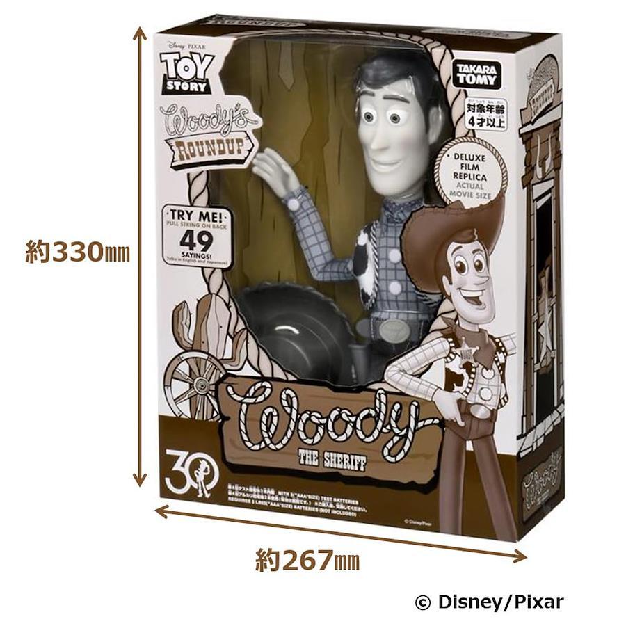 『トイ・ストーリー』30周年記念商品!映画に登場するテレビ番組「ウッディのラウンドアップ」の中から飛び出してきたようなウッディ!映画そのままのリアルサイズのフィギュアです。背中のひもをひくと映画そのままの声でセリフをおしゃべりします。日本語と英語の切り替えができます。日本語と英語合計49種のセリフが楽しめます。帽子は着脱できます。