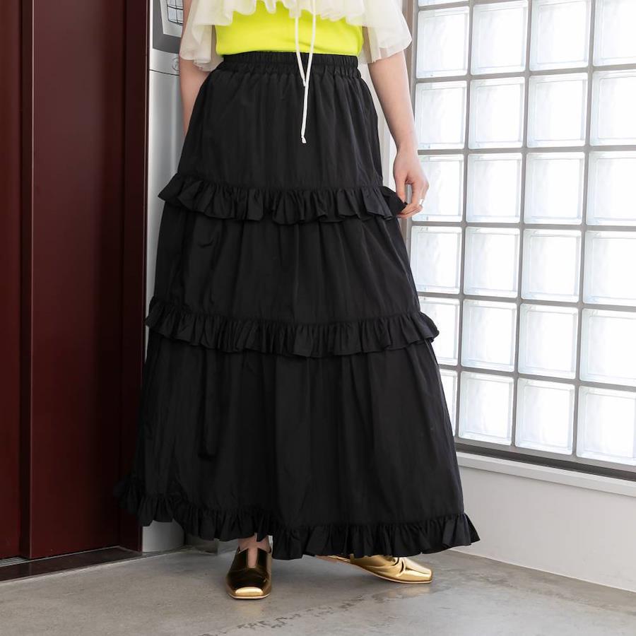カジュアルなタフタ素材を使用することで、甘すぎないティアードスカートに仕上げました。