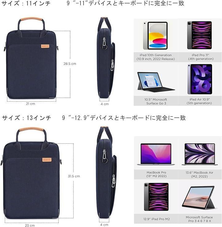「寸法&互換性」外寸:23.5 x 32 x 4.2 cm / 9.3 x 12.6 x 1.8 inch (LxWxH),内寸: 22.5 x 31 x 2.5 cm / 8.9 x 12.2 x 1 inch (LxWxH);メインコンパートメントの中の内ポケット:21.5 x 30.5 x 1.5 cm / 8.5 x 12 x 0.6 inch,と互換性があり: 12.9 iPad Pro M2-2018, 13.6 Macbook Air M2, 13 Macbook Air M1-2018, 13 MacBook Pro 2016-2022 M2, Surface Pro 3 4 6 7 X, Surface Laptop Go, 12.6 HUAWEI MatePad Pro, 13.3 13.4 Dell XPS 13