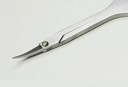 エッチングバサミは専用工具ならではの焼き入れと刃付けを施し、硬いステンレス製のエッチングパーツも簡単にカットでき、しかも部品を変形させる心配も皆無。刃先を守るキャップ付き。刃の長さが約1cmの小型サイズですから、狭いすきまにも刃先が入り、繊細なパーツの切断が可能。さらに微妙に曲がった「そり刃」を採用。切断部分がよく見えるので、バリを最小限におさえることができ、その後の仕上げ作業もスピーディーに行うことが可能。