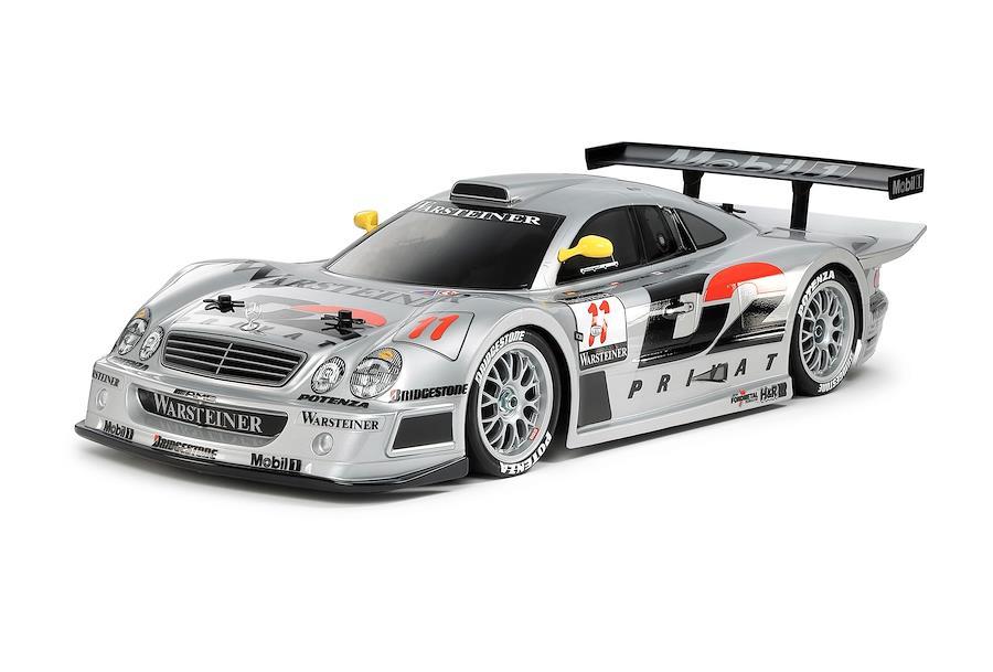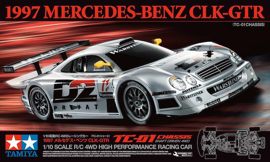 1997年のFIA GT選手権を制したメルセデス・ベンツ CLK-GTRが、シャフトドライブ4WDのTC-01シャーシを採用して登場です。前後ともオイルダンパーを水平縦置きとしたインボードサスペンションを採用。オイル粘度で効きの調整が可能なオイル封入式ギヤデフを前後に装備。ロー&ワイドの空力ボディはポリカーボネート製。