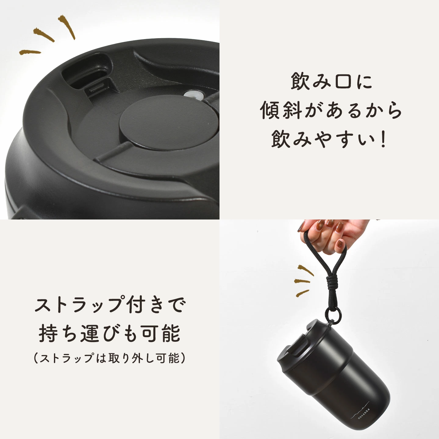 【NEW STANDARD CERAMIC TUMBLER / ニュースタンダード セラミック タンブラー】香りに敏感で、ステンレスのにおいが苦手、スローペースで飲まれる方におすすめのタンブラー。「nosanka」は内側にセラミック加工構造なのでステンレス特有の金属臭はありません。長時間コーヒーなどの飲み物を入れておいても金属特有のニオイがつく心配がなく、コーヒー本来の香りや風味をお楽しみいただけます。また、スポーツドリンクやスープ、炭酸飲料にもご使用いただけます。飲み口に傾斜があるから飲みやすく、取り外し可能なストラップが付いているので持ち運びも可能です。