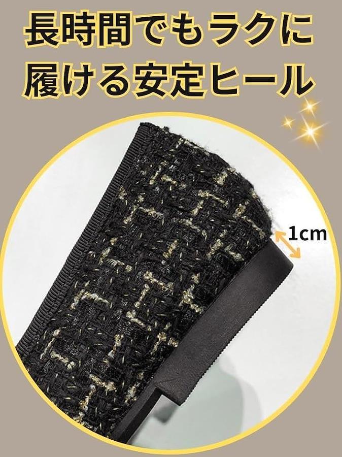 「大人可愛いラメ入りツイードデザイン」甲部分にはツイード調の織り素材を採用し、柔らかな質感と高級感を演出。