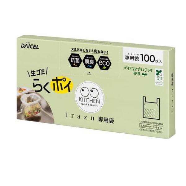 製品の特徴●ダイセル 三角コーナーいらず irazu 専用袋●脱臭抗菌剤(デオセプト)配合でヌルヌルやイヤな臭いを抑えます。●環境に配慮した植物性由来のバイオマス原料を10%配合した水切り袋です。●本商品は、三角コーナーいらず本体(別売)にご使用可能です。●収納に便利な箱型水切り袋。●背面にフック穴がついており吊り下げ収納可能。●大容量100枚入り。●サイズ:タテ310mm×ヨコ240mm/厚さ0.01mm●耐熱温度:100℃●耐冷温度:-30℃