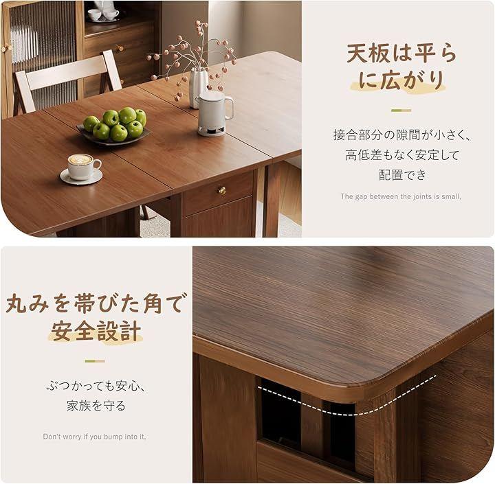 テーブルは半分だけ開いて2~3人用、完全に開けば4~6人用として使え、状況に応じてサイズを調整できるため、限られたスペースでも活用しやすいです。