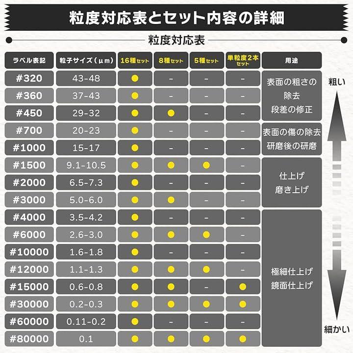 「嬉しい2本セット」5gが2本入ってお得に沢山使えます、選べる粒度は最大で#80000まで、用途に応じた最適な粒度をお選びいただけます。