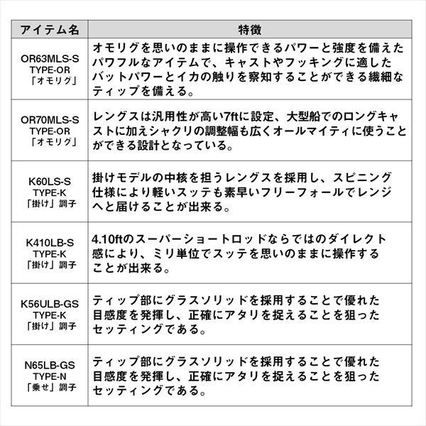 高い実釣性能を誇るイカメタル・オモリグのベーシックモデル。現代イカメタル・オモリグシーンに必要とされる性能やテクノロジーを詰め込んだべーシックモデル・エメラルダスMX。■K60LS-S・W TYPE-K(「掛け」調子)・・・積極的に誘ってアタリを捉えるファストテーパーの「掛け」モデル。K60LS-Sは掛けモデルの中核を担うレングスを採用し、スピニング仕様により軽いスッテも素早いフリーフォールでレンジへと届けることが出来る。幅広いウエイトのスッテに対応し、スピニングならではのキャスト&カーブフォールで攻めるタクティクスにも完全対応した一本である。 全長:1.83m 重量(g):77 継数:2 仕舞寸法(cm):96 スッテサイズ:30-115g/8-30号 適合ライン(PE):0.4-1.0号 先径/元径(mm):0.8/7.4 カーボン含有率(%):88 ※実物と色が違って見える場合があります。あらかじめご了承下さい。