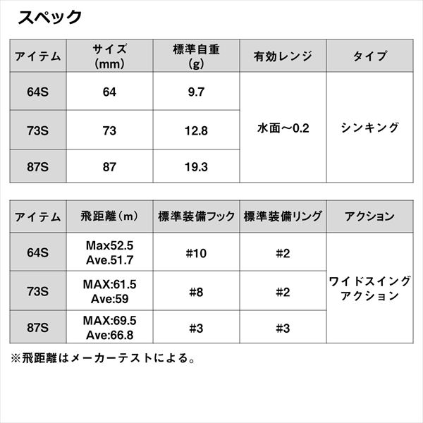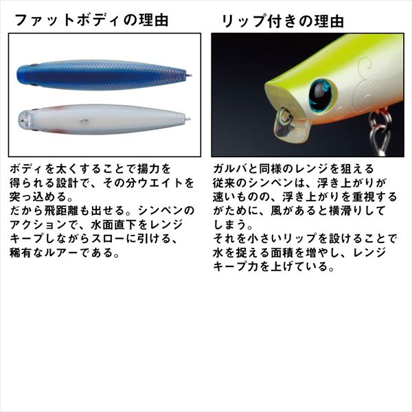 「湾奥のプリンス」大野ゆうき監修。ベイエリア、河川攻略に最適なスローピッチコンパクトシンキングペンシル。ターゲットレンジは水面直下から水面下約20cm。数多の試作を繰り返した末、絶妙の長さと角度で設計されたショートリップを装備したことで、素早い浮上性能とレンジキープ性能を両立。そのパラシュート効果により風のある状況でも上ずりと横滑りを軽減し、誰でも水面直下をイージーにトレース可能。また固定ウエイトながらキャスタビリティは秀逸。さらにスレさせにくいスローピッチアクションで激戦区の湾奥ゲームに最適。 全長(mm):64 重量(g):9.7 タイプ:シンキング フック:#10 リング:#2 飛距離(m):Max52.5、Ave51.7 レンジ(m):水面~0.2 ※実物と色が違って見える場合があります。あらかじめご了承下さい。