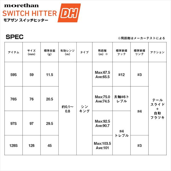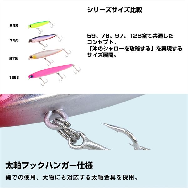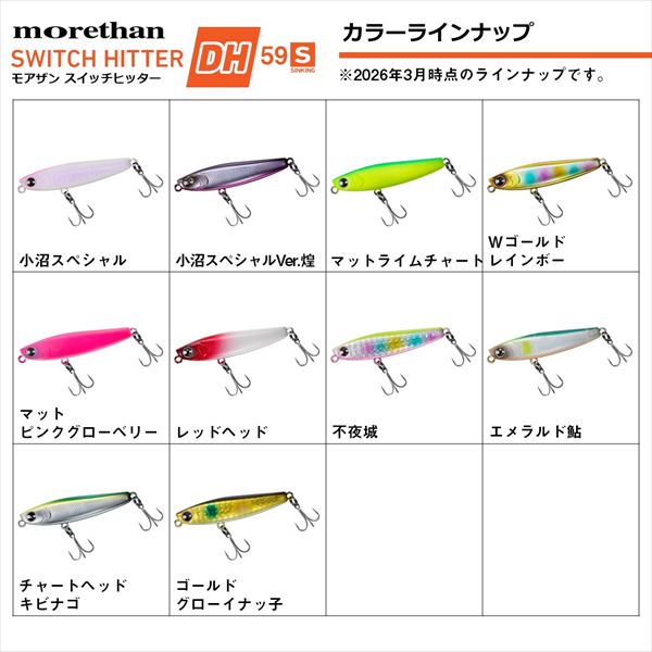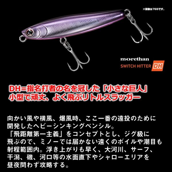 小沼正弥監修。「DH=指名打者」の名を冠した「飛距離第一主義」のホームランバッター。向かい風や横風、爆風時、ここ一番の遠投のために開発したヘビーシンキングペンシル。「飛距離第一主義」をコンセプトとし、ジグ級に飛ぶので、ミノーでは届かない遠くのボイルや潮目も射程範囲内。浮き上がりも早く、大河川、サーフ、干潟、磯、河口等の水面直下やシャローエリアを昼夜問わず攻略する。 全長(mm):59 重量(g):11.5 タイプ:シンキング フック:#12 リング:#3 飛距離(m):Max67.5、Ave 65.5 レンジ(m):約0.1-0.8 アクション:テールスライド+自動フラツキ ※実物と色が違って見える場合があります。あらかじめご了承下さい。
