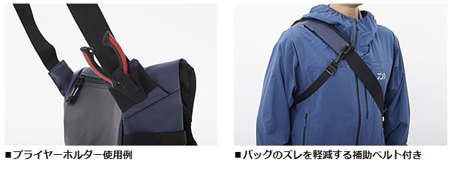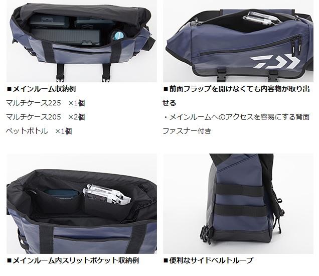 機能性、大容量を兼ね備えたメッセンジャータイプ。前面フラップを開けなくても内容が取り出しやすい背面ファスナー。メインルームに中型ボックス(26×19cm程度)を4個収納可能。小物類の収納に便利なスリットポケットを4か所配置。ポーチや小物類が取り付け可能なサイドベルトループ。プライヤーホルダー、ペットボトルホルダー(内側)、Dリング付き。肩への負担を軽減するパッド付き肩ベルト。バッグのズレを軽減する補助ベルト付き。ウエア等を仮収納できるバンジーコード付き。 本体外寸:約14×35×27cm 素材:POLYESTER、PVC ※実物と色が違って見える場合があります。あらかじめご了承下さい。