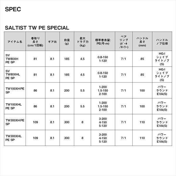 振り切るのは爽快!SALTIST TW PE SPはソルトでのPEベイトキャスティングに特化させることで、トラブル無く使用できることを目指した。これまでベイトリールでのPEラインの使用に抵抗があったアングラーでも安心して「振り切る」ことが可能。それを実現させたのがライン放出性が極めて高い「TWS」と、糸巻き状態を大幅に改善しPE専用のセッティングを施した「PE専用スプール」。さらに基本性能を「HYPERDRIVE DESIGN」で磨きをかけ、ソルトでの幅広いシーンにも対応する。サイズは80/100/300で展開し、全国の様々な魚種の対応可能。これからPEベイトキャスティングを楽しみたいユーザーやPE対応力を求めるユーザーに向けたSWベイトキャスティングリールのニュースタンダード。 標準自重:200g 巻取り長さ:86cm/ハンドル1回転 ギア比:8.1 標準巻糸量PE:1号-200m、1.5号-150m、2号-100m ハンドルアーム長:100mm ベアリング(ボール/ローラー):7/1 最大ドラグ:5.5kg スプール寸法(径):34mm ハンドルノブ仕様:パワーラウンドEVAノブ(S) ※実物と色が違って見える場合があります。あらかじめご了承下さい。【ダイワ キャスティング情報2023】