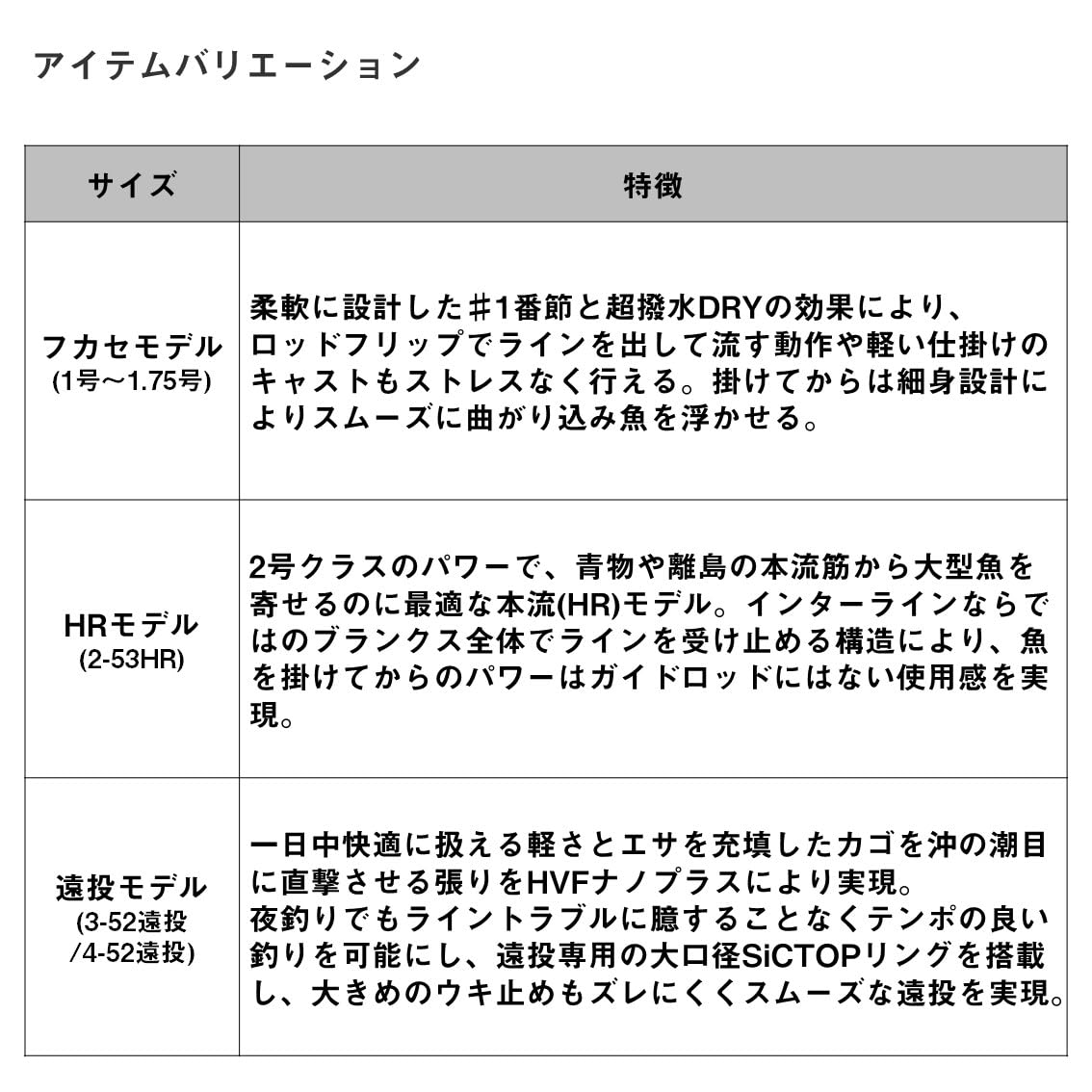 細身肉厚設計を採用した次世代ハイスペックインターラインモデル。従来のインターラインよりも圧倒的に細身化することで、全体的にしなやかに曲がりこみ、暴れさせずイナして獲る胴調子へと進化。 インターライン最大の特徴であるブランク内部にラインを通す構造とダイワ独自の超撥水DRY加工により、雨、風、波しぶきなどによるラインのロッドへの ベタツキや糸ガラミを防ぎ、小型ウキなどの軽い仕掛けの振り込みもストレスなくスムーズ。 スクリュータイプのオリジナルシートは、リールのガタツキを軽減し、一日中快適な釣行を可能にする。