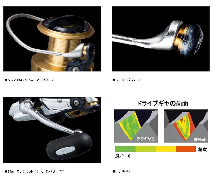 スピニングリールサイズ:6000使用できる釣法:タイラバ主なターゲット:フエフキダイ標準巻糸量ナイロン(号-m):10-250、12-200 ベアリング:4 エアベール自重:610g巻取り長さ(ハンドル1回転あたり):82cmギア比:4.1最大ドラグ力:15kg