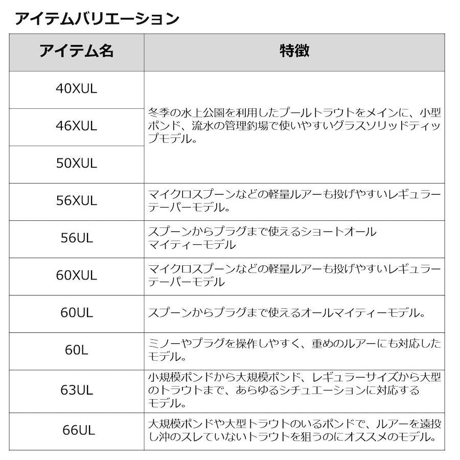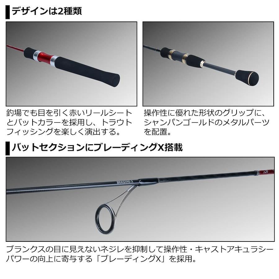 ブランク最外層をX状にカーボンテープで締め上げた、ネジレを抑える強化構造「BRAIDING X」を搭載したハイパフォーマンスエリアトラウトロッド。エリアのトラウトに対応する仕様とラインナップ。部門名: ユニセックス大人生産国:中国【免責事項】※メーカーのリニューアルに伴い仕様・カラー等が予告無く変更になる場合がございます。新パッケージでお届け致します事ご了承願います。