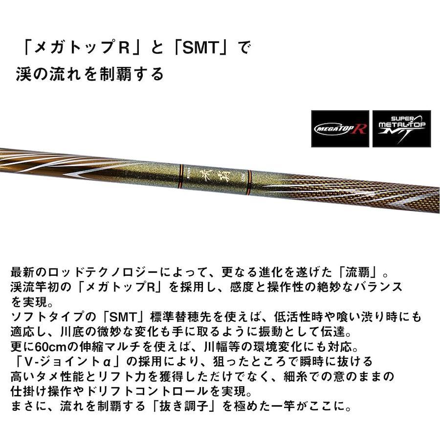 最新のロッドテクノロジーによって、更なる進化を 遂げた「流覇」。 抜調子ながら、従来のチューブラー穂先から新たに 「メガトップR」を採用し、感度と操作性の絶妙な バランスを実現。ソフトタイプの「SMT」標準替穂先に 替えれば、低活性時や喰い渋り時にも適応し、川底の微妙な変化も手に取るように振動として伝達。 更に60cmの伸縮マルチにより、川幅等の環境変化にも対応。また、「V-ジョイントα」の採用により、狙ったところで瞬時に抜ける高いタメ性能と リフト力を獲得しただけでなく、細糸での意のままの仕掛け操作やドリフトコントロールを実現。 まさに、流れを制覇する「抜調子」。
