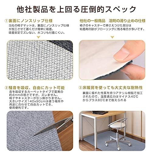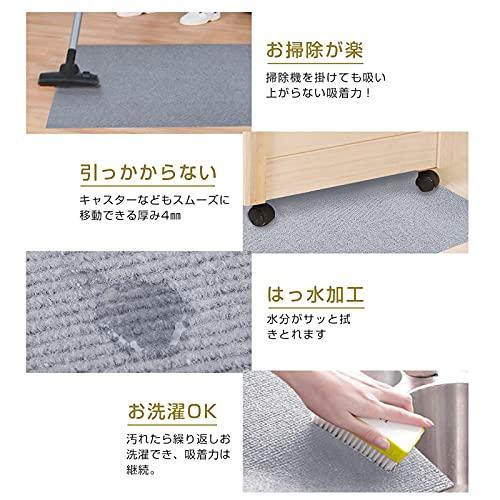 サイズ/90×140cm(厚み4mm)。ご注意:商品ページの画像はできるかぎり、実際の商品の色味に近づけるように徹底しておりますが、お使いのモニター・お部屋の照明などにより若干異なって見える場合がございます。 本体:表面/ポリエステル、裏面/アクリル樹脂(カテキン入り)。裏面に優れた性質を持つアクリア樹脂で加工されたので、温度適応力は-40℃からプラス80℃まで耐えられる、床暖房を使っても大丈夫な耐熱性。 音を吸収するカーペットタイプで驚異の約4mmの薄さですが、ズレません。椅子やキャスターが引っ掛かりません。段差を気にせず、移動もスムーズ。 使う場所や用途に合わせて自由にカットでき、使用便利です。 洗えて繰り返し使用可能。汚れたら、手洗いで繰り返し丸洗い可能。薄いので、分厚いマットと比べ、乾きも速い。 使わない時は巻き取り簡単に収納できます。 【安心保証】万が一商品に不具合がある場合、商品自体の問題がある場合(初期不良など)は、弊社にご連絡いただければ迅速に対応いたします。1年間の品質保証があるから、安心してお買い求め頂けます。本製品は簡易包装でお届けします。商品がお手元に届きましたら、広げて数日置いておいて頂ければ通常サイズに戻ります。或いは、水に入れて取り出してから日干しして頂けますと、折り目も消えて、通常サイズに戻りますのでお試しくださいません。