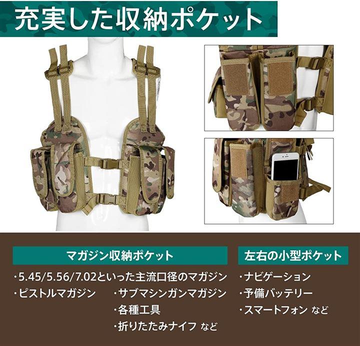 「充実した収納ポケット。」・マガジン収納ポケット・5.45/5.56/7.02といった主流口径のマガジン、ピストルマガジン、サブマシンガンマガジン、各種工具、折り畳みナイフなど・左右の小型ポケット・ナビゲーション、予備バッテリー、スマートフォンなどそれぞれ収納可能です。
