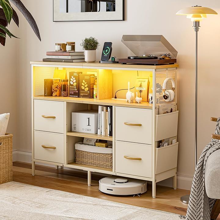 チェスト収納 タンス 棚付き 箪笥リビング収納チェスト LEDライト付き テレビボード おしゃれ 収納ケース 引き出し 大容量 USBポート付き洋服タンス 布製 玄関キャビネット