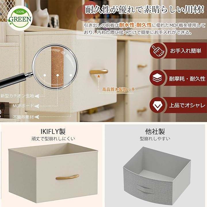 置きやすく、使いやすいコンパクトサイズながら収納力抜群で、リビングの小物整理から寝室の衣類収納まで大活躍。引き出しは軽量で取り外し可能なため、中身の整理やお掃除も簡単です。