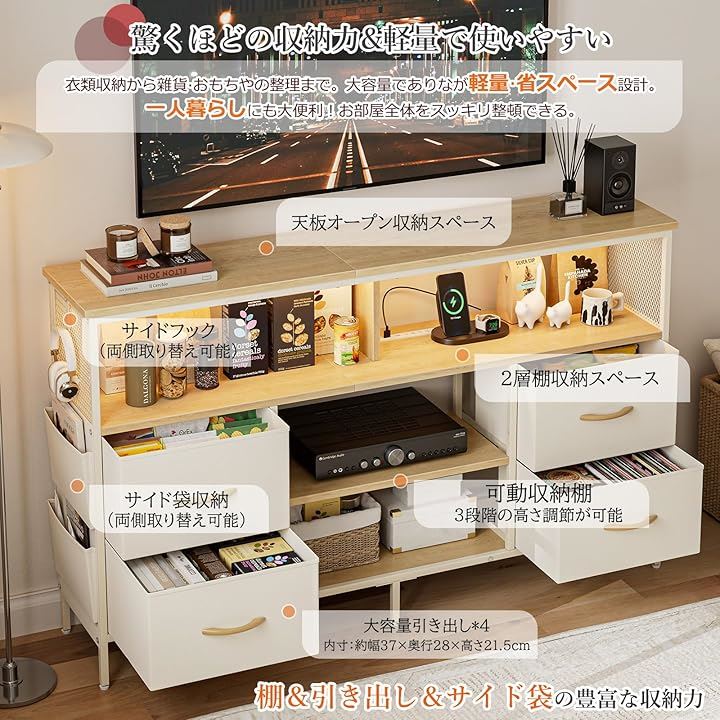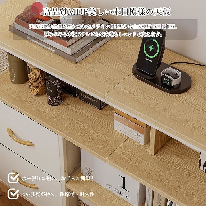 テレビやコーヒーメーカーなどの小型家電を収納しながら、手元で充電できる便利さが特徴です。
