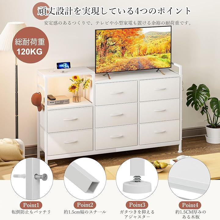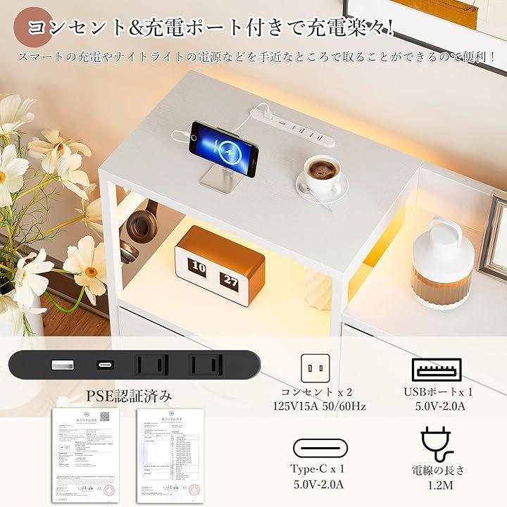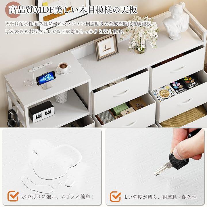 「便利なコンセント付きの天板+2段棚&6杯引き出し」チェスト天板の上にコンセント口2口とUSB&TypeCポートを備え、デスクライトの電源やスマートフォンの充電などを手近なところで取ることができるので便利です。