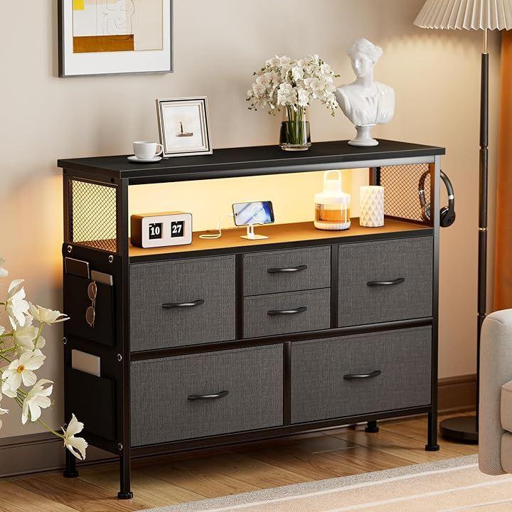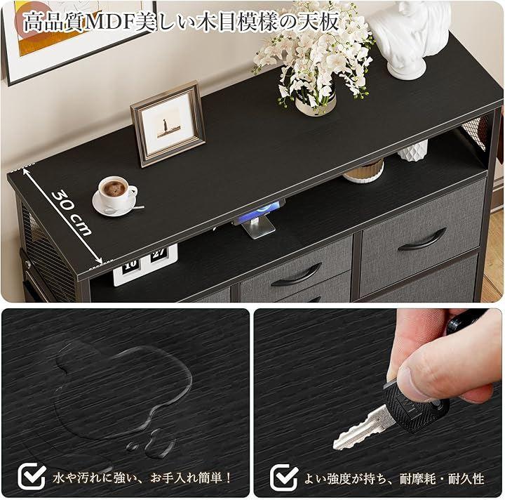 「便利なコンセント付きの天板+2段棚&6杯引き出し」チェスト天板の上にコンセント口2口とUSB&TypeCポートを備え、デスクライトの電源やスマートフォンの充電などを手近なところで取ることができるので便利です。