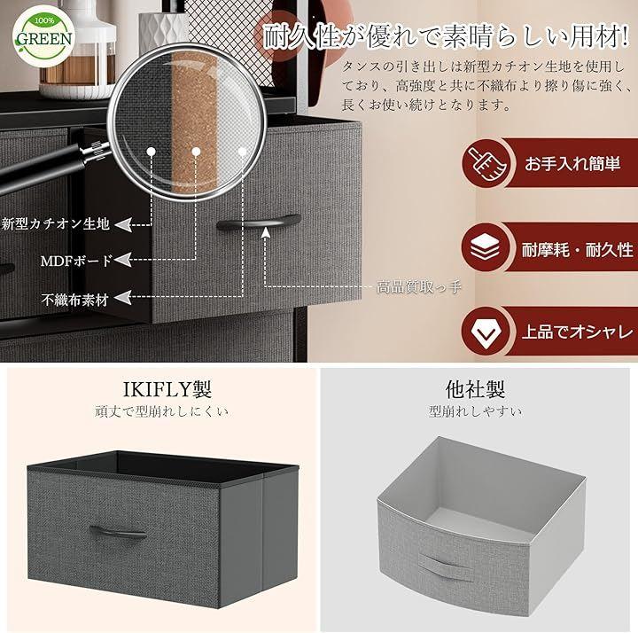 「暮らしに馴染むシンプル設計」木目の美しいウッドデザイン天板、柔らかな表情の不織布の引き出し、空間をスマートに引き締めるスチールフレーム。