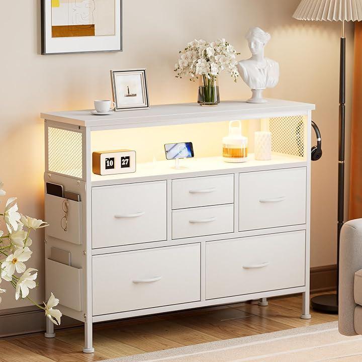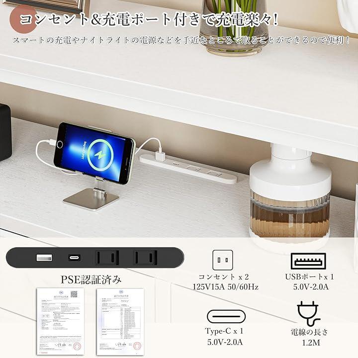 「便利なコンセント付きの天板+2段棚&6杯引き出し」チェスト天板の上にコンセント口2口とUSB&TypeCポートを備え、デスクライトの電源やスマートフォンの充電などを手近なところで取ることができるので便利です。