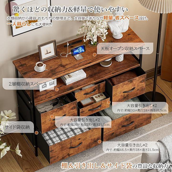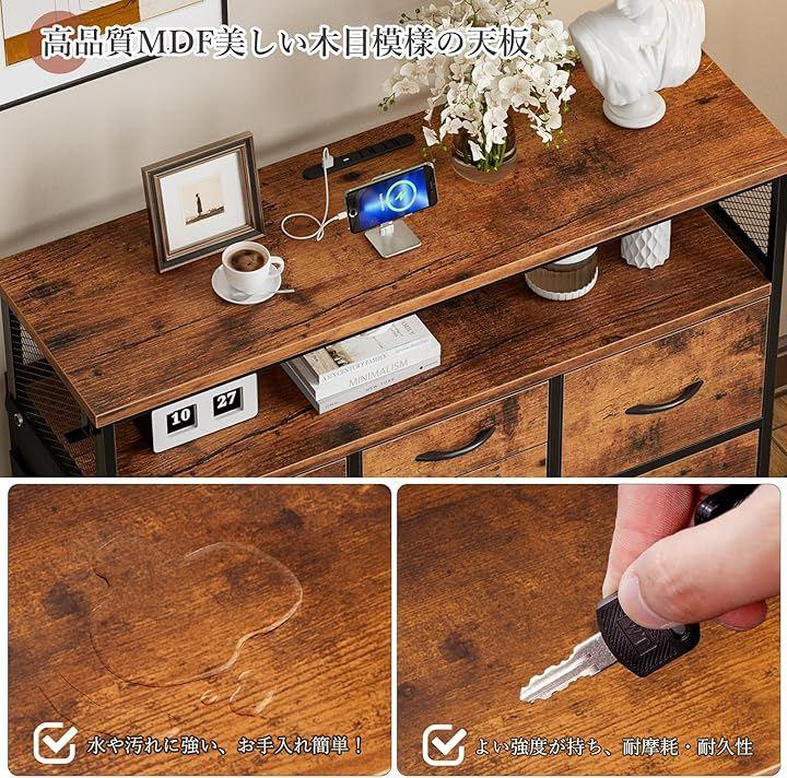 「便利なコンセント付き天板+2段棚&6段引き出し」天板にはコンセント2口とUSB/Type-Cポートを装備。