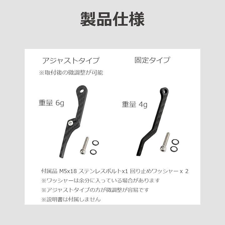 「製品仕様」本体重量:固定タイプ4g 調整タイプ6g 素材:カーボン(CFRP) 内容物:本体x1 M5x18ステンレスボルトx1 回り止めワッシャーx2(余分に入っている場合があります) *お求めやすさを実現するため説明書の作成を省略しています。