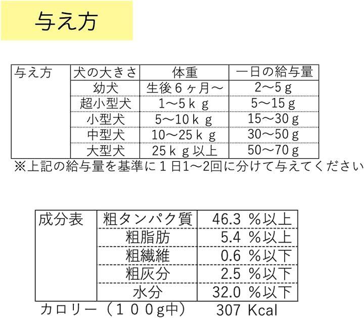 幼犬生後6か月から 2~5g、超小型犬1~5KG 5~15g、小型犬5~10KG 15~30g、中型犬10~25KG 30~50g、大型犬25KG以上 50~70g、給与量を基準に1日1~2回に分けて与えて下さい