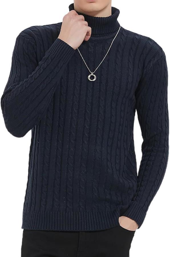「上品さとスタイリッシュさを兼ね備えた」高いデザイン性とスリムなシルエットが特徴のケーブル編みニットタートルネックセーター。