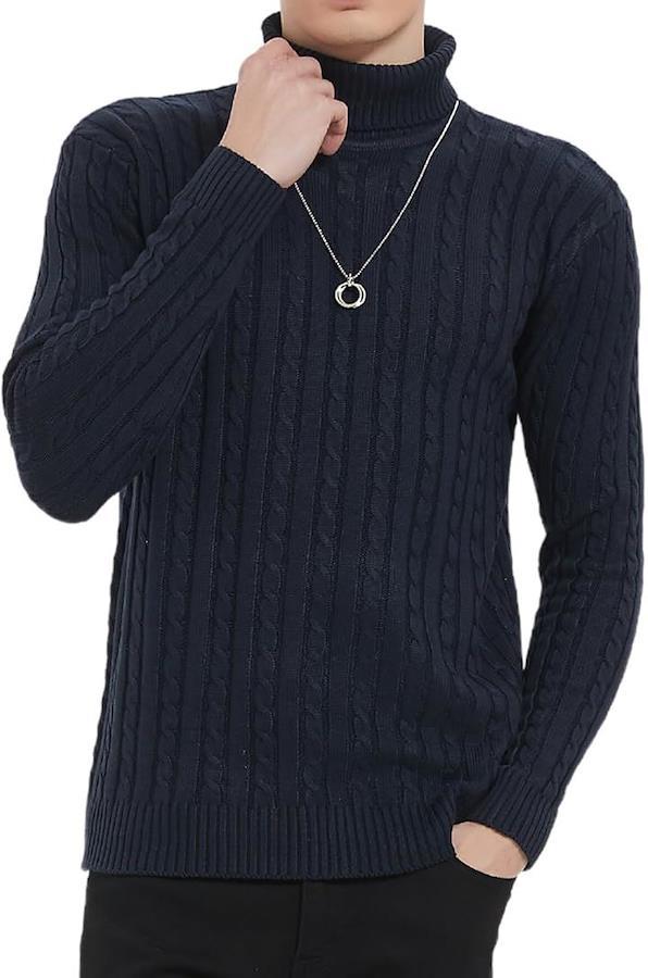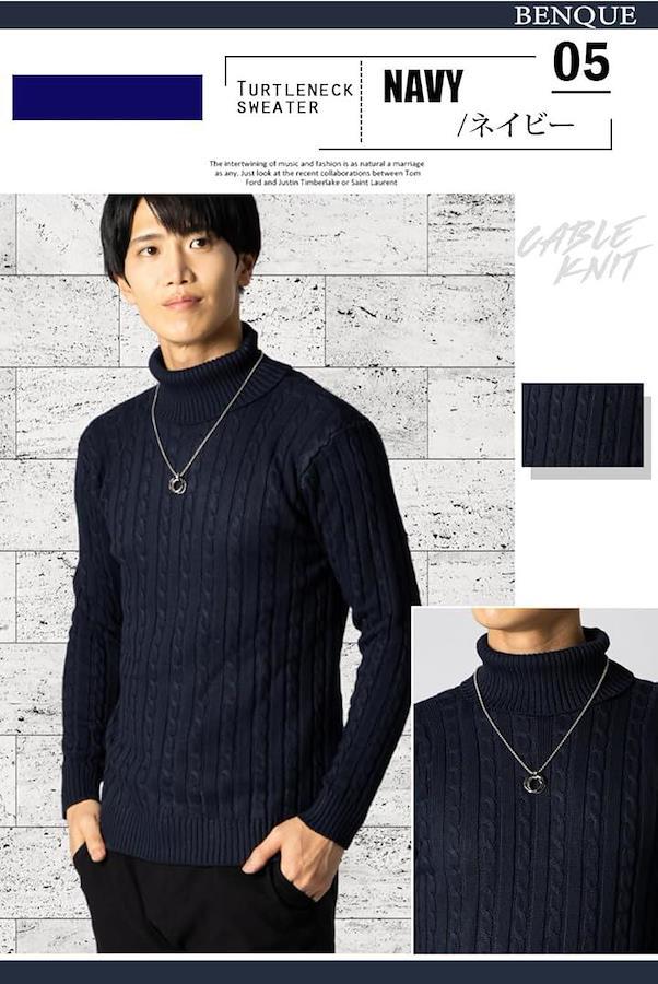 「上品さとスタイリッシュさを兼ね備えた」高いデザイン性とスリムなシルエットが特徴のケーブル編みニットタートルネックセーター。
