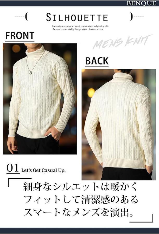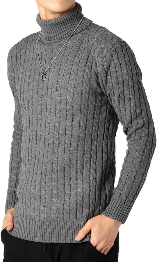 「上品さとスタイリッシュさを兼ね備えた」高いデザイン性とスリムなシルエットが特徴のケーブル編みニットタートルネックセーター。