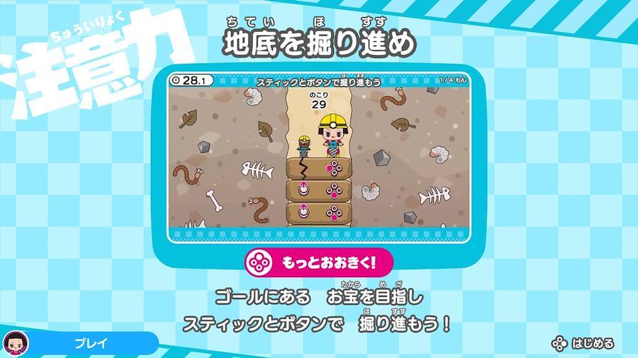 ・難易度は「ラクラクテスト」、「ふつうのテスト」、「超活性化テスト」の3種類!難易度ごとに問題内容も変わるため、問題ボリューム数は24種類×3難易度の全72種類!子供から大人まで幅広い年代が一緒に遊べます。