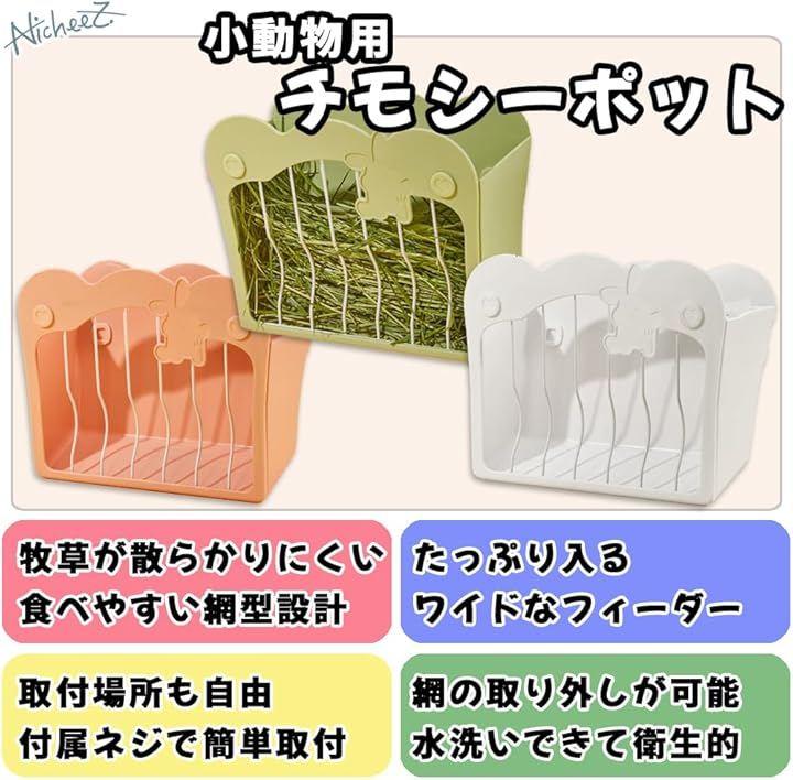 「牧草が散らかりにくいチモシーポット」ウサギやモルモットなどが食べる牧草がたっぷり入れられるワイドーなフィーダーです。