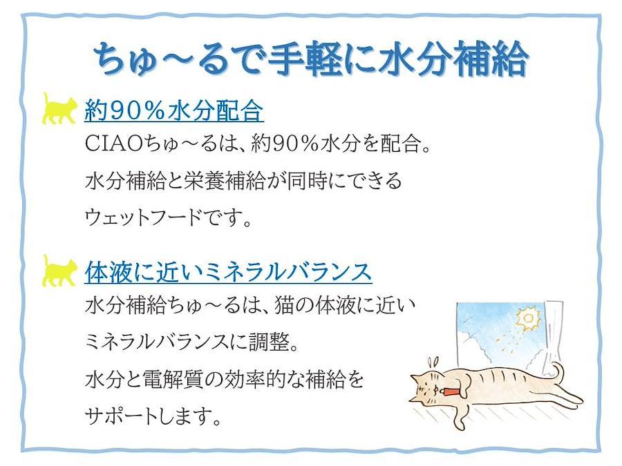 ・愛猫の体液に近いミネラルバランスに調整することにより、水分と電解質の効率的な補給をサポート・ちゅ~っと出して、なめるだけで簡単に栄養補給・水分補給ができます。