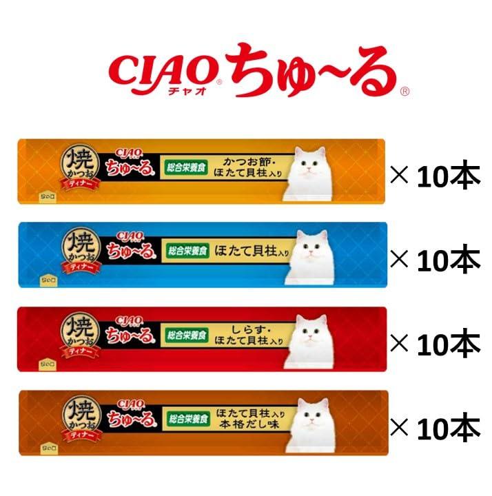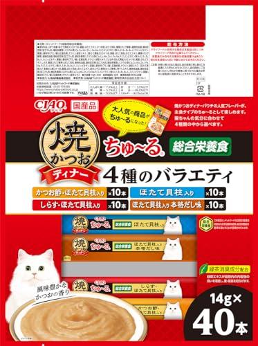 好評の焼かつおディナーがちゅ~るになりました。かつおのペーストに猫ちゃんの好きな素材をトッピング。猫ちゃんに必要な栄養素をバランスよく配合した総合栄養食。4種類の味が楽しめるバラエティパック。