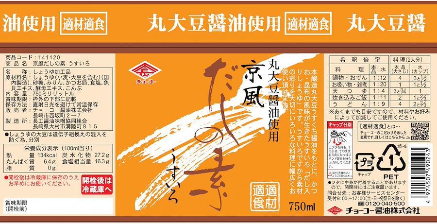 しょうゆ(小麦・大豆(遺伝子組換えでない)を含む)、砂糖、みりん、食塩、かつお節、こんぶエキス、魚貝エキス、酵母エキス大豆(遺伝子組換えでない)・小麦を含む)、砂糖、みりん、かつお節、食塩、こんぶエキス、魚貝エキス、酵母エキス