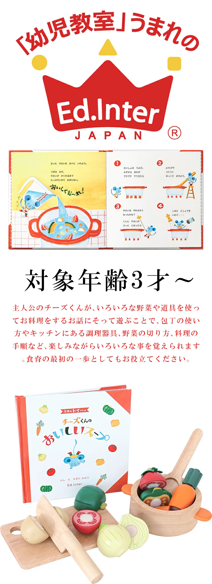 主人公のチーズくんが、いろいろな野菜や道具を使ってお料理をするお話にそって遊ぶことで、包丁の使い方やキッチンにある調理器具、野菜の切り方、料理の手順など、楽しみながらいろいろな事を覚えられます。食育の最初の一歩としてもお役立てください。対象年齢3才~