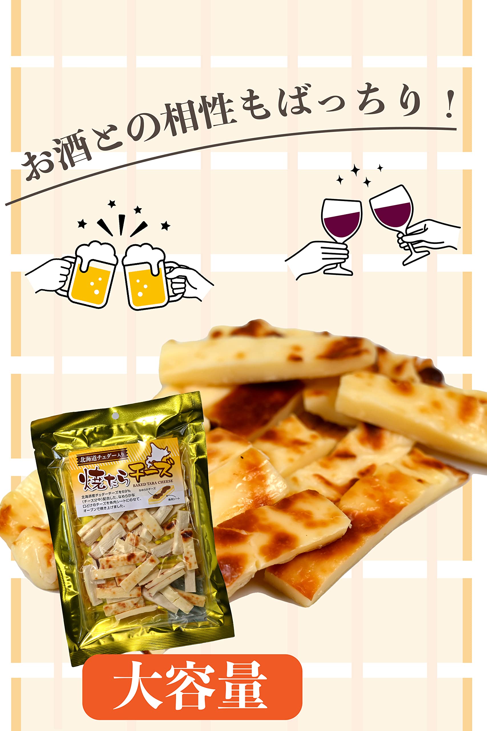 【チェダーチーズ入りの濃厚な味わい】定番のチーズおやつ、チータラに北海道チェダーチーズを配合!しっとりとくちどけ滑らかな食感に、濃厚な味わいをご賞味いただけるチータラです。絶妙なチーズの配合により、しっかりとチーズの味わいを楽しみながらも、飽きのこない、いつまでも食べていたくなる味わいがお楽しみいただけます。【焼き上げて香ばしさアップ!】通常のチータラに片面のみ焼き目をつけることで、チーズおやつ好きにたまらない、香ばしさとチェダーチーズの風味がアップ!焼き目が食欲をそそるチーズスティックとなっています。ぜひ、見栄えにもこだわったチータラをお楽しみください。【濃厚な旨味と絶妙しっとり食感】食感にもこだわったチータラは、口当たりの良いしっとりとした食感が魅力的。パサつかず、チーズの滑らかさを感じさせてくれる仕上がりとなっています。焼酎や日本酒など、酒のおつまみとしても相性抜群!ぜひ、晩酌のお供としてもお楽しみください。【業務用・大容量でも!】食べきりサイズをセットにした大容量版もあるチータラです。お酒のつまみとしてはもちろん、チーズスティック状でチェダーチーズの味わいが食べやすくお子様のおやつ、お菓子としてもおすすめのチーズおやつとなっています。食卓の一品としても見栄えが良く、ご家族皆さまでお楽しみいただける美味しいチータラです。業務用複数袋のセットも人気です。【アレンジでより美味しく、より楽しく♪】そのままでももちろん美味しいチータラですが、レンジでほんの少し温めていただくと、よりしっとり風味豊かな味わいがお楽しみいただけます。さらに、お好みで山椒や黒コショウをふったり、料理の具材としてサラダや炒め物に入れたりと、アレンジも豊富に楽しめるチーズおやつです。【重要】メーカーによる商品リニューアルに伴いパッケージ(内容量も含む)変更が行われた場合、新パッケージでお届け致します事ご了承願います。