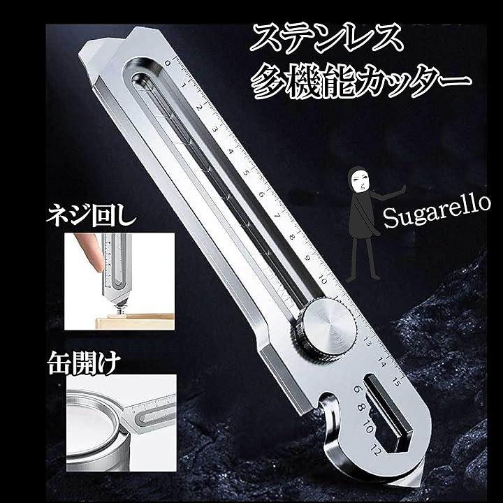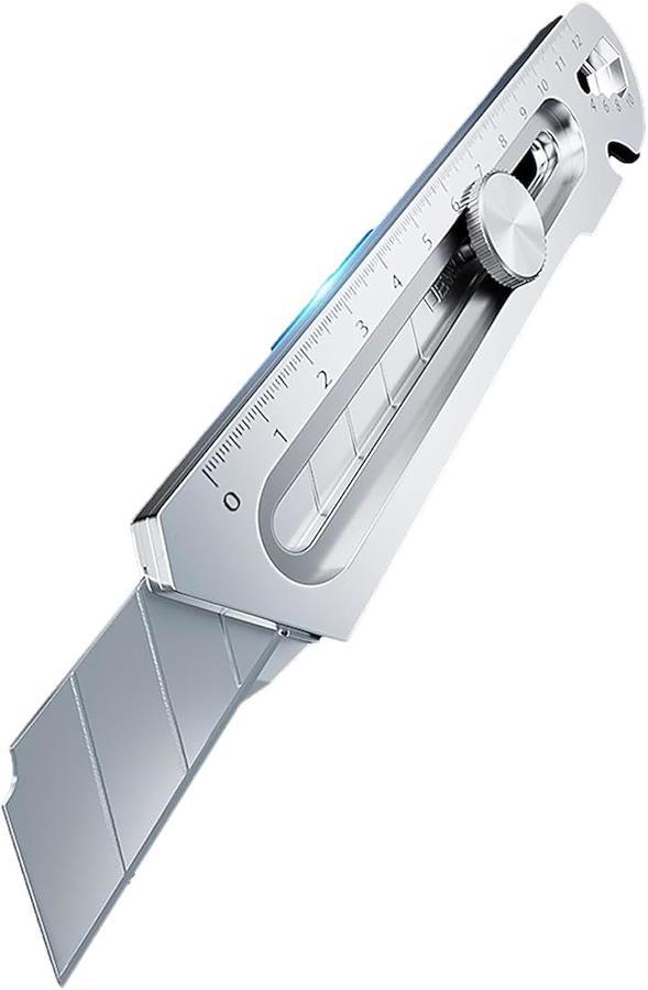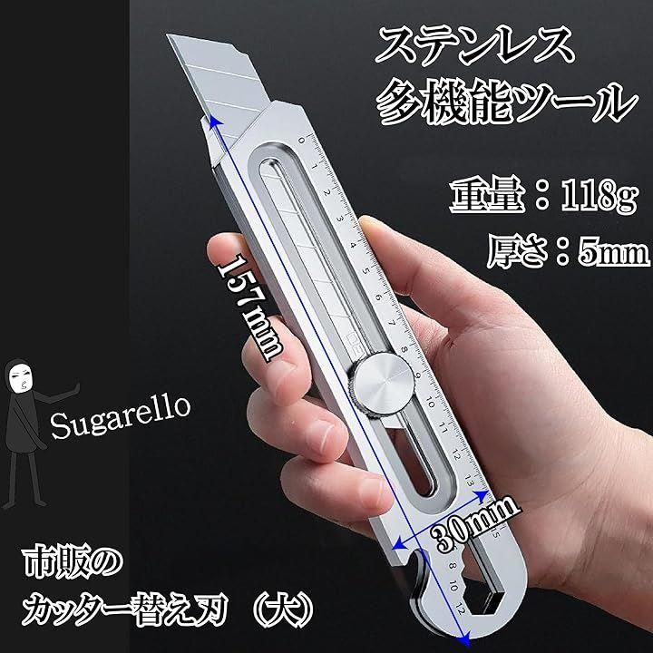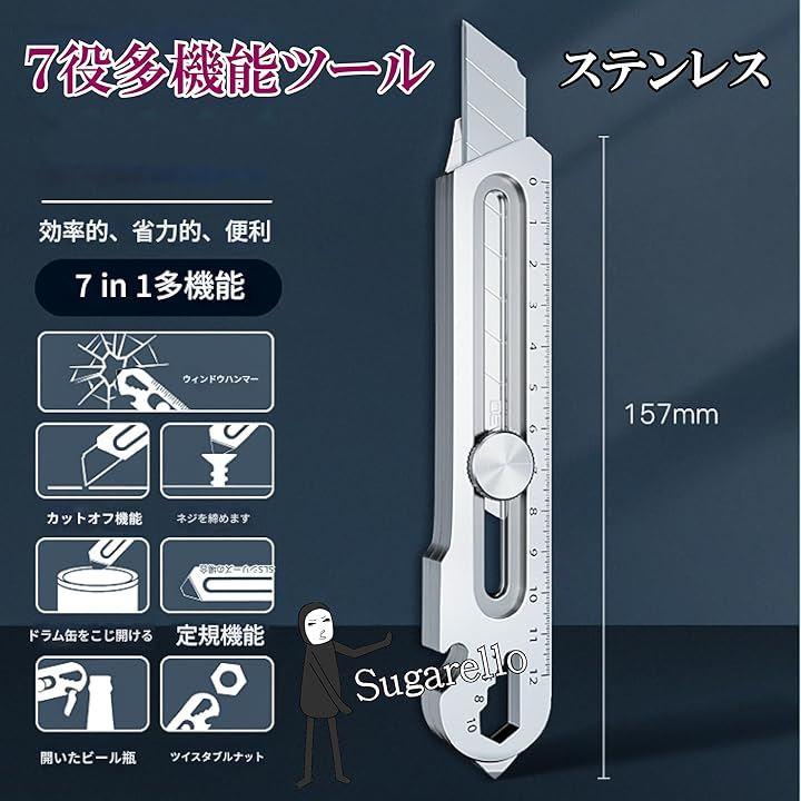 カッターナイフ、ネジ回し、ナット・ボルト回し、缶のフタ開け、定規、栓抜き、ガラス破壊ツールとして、7通りに使用できる多機能カッターナイフです。