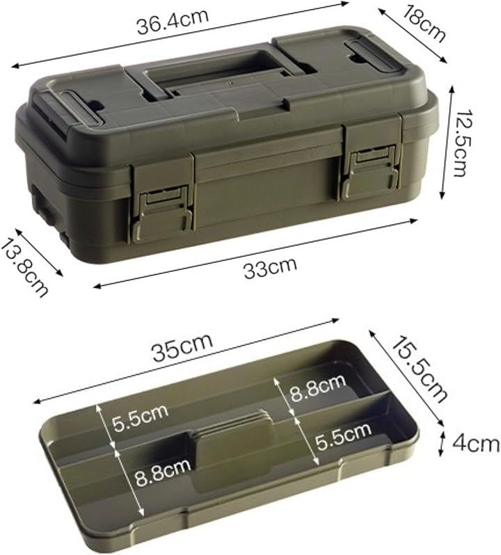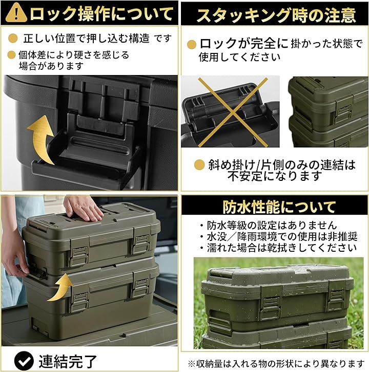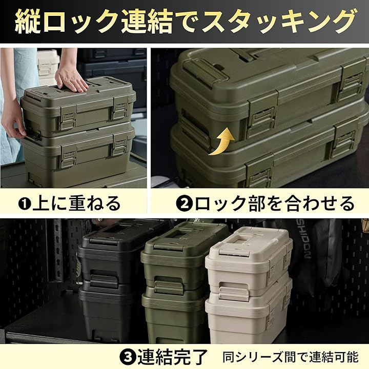 「仕様」 容量:約4L 外寸:約 幅36.4x奥行18x高さ12.5cm(底面約33x13.8cm) 材質:プラスチック カラー:ブラック/グリーン 付属:仕切り(トレー) 機能:連結ロック・スタッキング *同シリーズと連結互換。