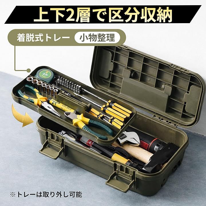 「上下2層で区分収納しやすい」 着脱式トレー付きで、ビット・テープ・小物は上段、ドライバー・レンチなどは下段へ。