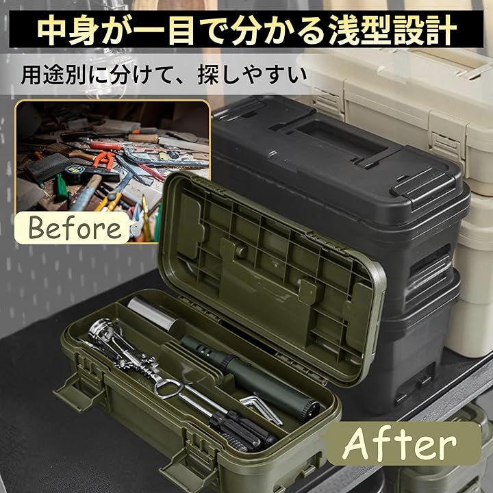 「車載・DIY・キャンプ小物の整理に」 工具箱としてはもちろん、車載備品、アウトドア小物、メンテナンス用品の収納にも使いやすいコンパクトサイズ。