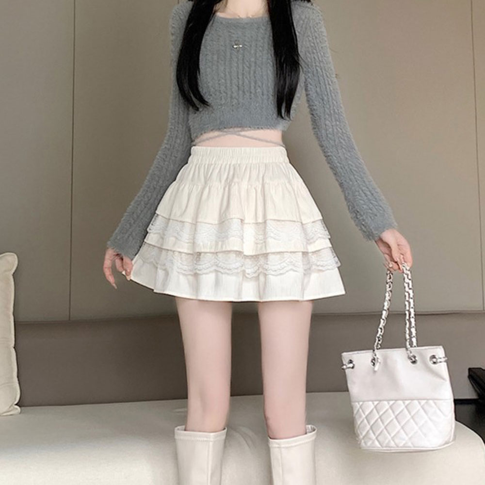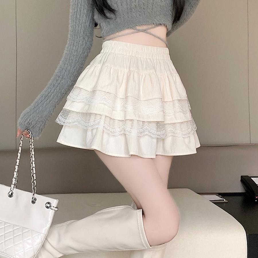 ティアードレースコーデュロイミニスカのご紹介。【デザイン】バレエコアなスタイリングにぴったり♪ふりふりデザインが可愛いミニスカパンです。ウエストは総ゴムになっており、履き心地も楽ちん♪裏地はパンツタイプになっているので、ミニ丈ですが安心して着用いただけます。