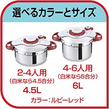 通常1-5営業日で発送:ティファール 圧力鍋 4.5L 2~4人用 IH ガス火対応 カンタン開閉 10年保証「クリプソ ミニット イージー ルビーレッド」P4620669サイズ: 圧力鍋 4.5L、色: ルビーレッドブランド ティファール(T-fal)容量 4.5 L材質 ステンレス鋼留め具タイプ 外蓋色 ルビーレッドサイズ(約):本体(取っ手・蓋付き)/幅37×奥行25×高さ18cm、本体高さ/13cm、本体深さ/12.5cm、本体内径/22cm、中かご/幅20×奥行20×高さ7cm、圧力鍋用ふた/幅25×奥行25×高さ7cm本体重量:2.2kg素材・材質:本体/ステンレスSUS304、底/アルミ・ステンレス、取っ手/フェノール樹脂、ふた/ステンレスSUS304、ふたハンドル・パネル/PBT(ポリブチレンテレフタレート)樹脂、セレクター(おもり)/ナイロン66、パッキング/シリコン、中かご/ステンレス生産国:フランス満水容量:4.5L片手でカンタン開閉。従来品より30%軽量で使いやすい【早い、おいしい、エコ】圧力なべは密閉して100度以上の高温で調理する